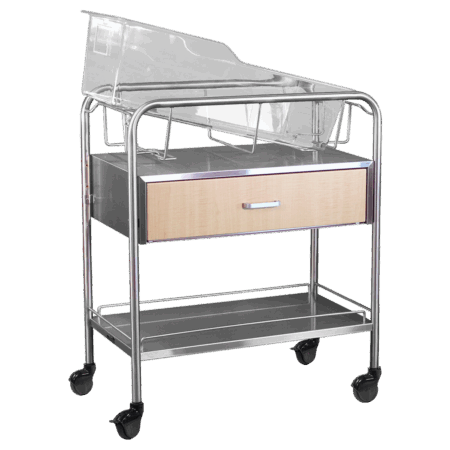 The Stainless Steel Wood Faced Bassinet with Drawer & Shelf is made of reinforced, heavy-gauge polished stainless steel. This bassinet is designed to provide a comfortable sleeping environment while also offering a quiet self-closing wood front cabinet drawer for storage.